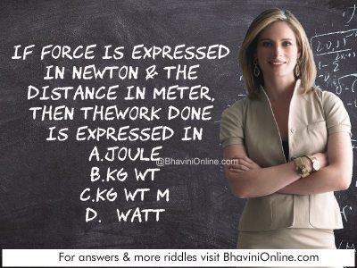 Do you like general knowledge questions? Answer this simple riddle about Physics and check your GK. If force is expressed in Newton and the distance in meter, then the work done is expressed in A. Joule B. Kg wt C. Kg wt m D. Watt So were you able to solve the riddle? Leave your […]