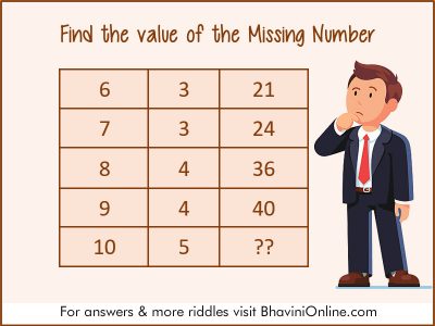 In this number riddle you will see a table with some numbers which are connected to each other in some way. Find the logic behind the numbers and then find the value of the missing number. Find the value of ? in the table below; 6 3 21 7 3 24 8 4 36 9 […]